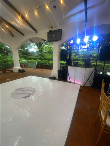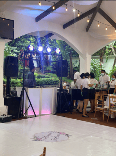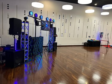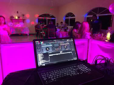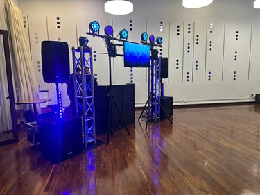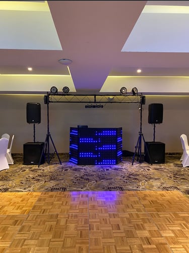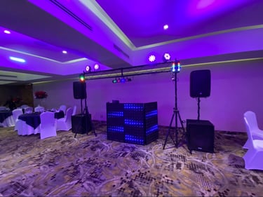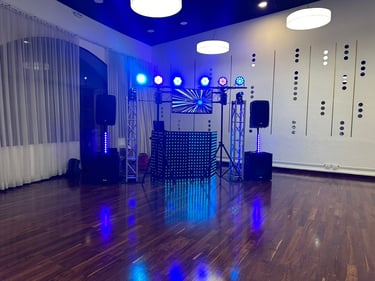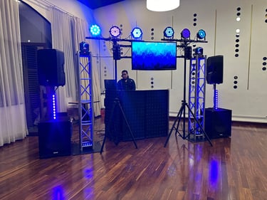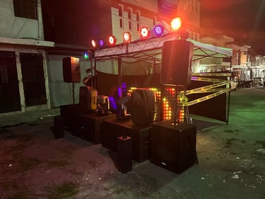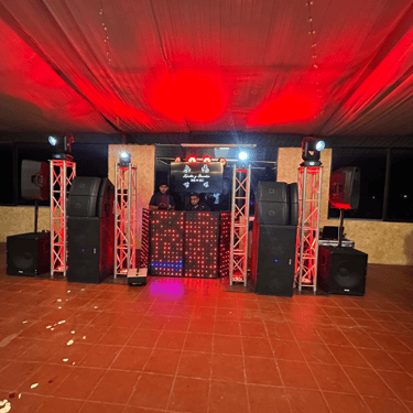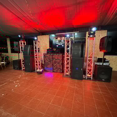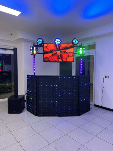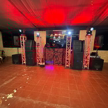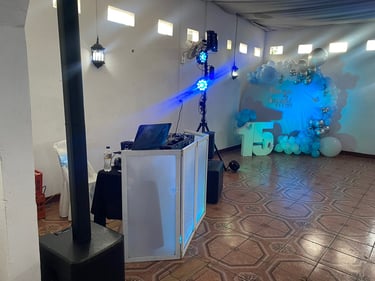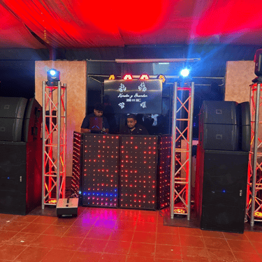 Paquete ideal para eventos formales (Bodas, XV años, Graduaciones) de hasta 150 personas en espacios intermedios que incluye Sonido envolvente 4 bocinas (2 subwoofer y 2 bocinas 15 pulg.) estructura tipo portería con 10 luces Led y Láser, máquina de niebla y burbujas (si el lugar lo permite) Cabina de DJ iluminada, DJ animador hprofesional con mezclas en vivo de música de todo género y época .