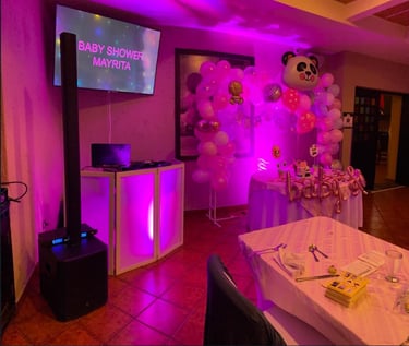 Ideal para eventos con familiares y amigos en casa o salones pequeños con máximo de 50 personas, incluye dos bocinas auto amplificadas de 1000 watts, 4 luces led audio rítmicas en pedestal, pantalla Led HD de 55 pulgadas, DJ Animador con música, videos y karaoke de todo género y época, 2 micrófonos inalámbricos