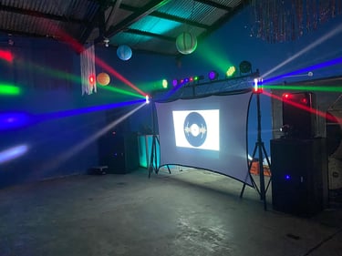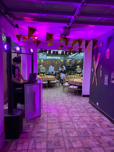Ideal para eventos formales de hasta 300 personas en lugares grandes cerrados o medianos al aire libre incluye Sonido envolvente 8 bocinas (4 sub y 4 bocinas medios y altos) estructura tipo portería con 12 luces Led y Láser audio rítmicas, matización de fondo con 6 luces led color fijo, máquina de niebla y burbujas (si el lugar lo permite) animación con 120 souvenirs variados según disponibilidad (sombreros, diademas, collares, barras led etc) pantalla de 120 pulgadas con retroproyector. Cabina DJ iluminada con DJ Animador Profesional en vivo con música y videos de todo género y época.