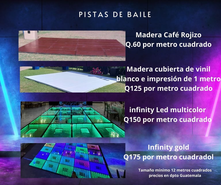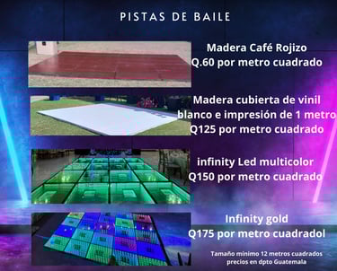 Precio Q4,000.00 hasta 5 horas, hora adicional Q700.00 (Pista de baile con costo adicional)