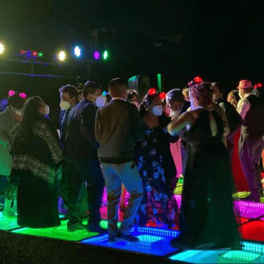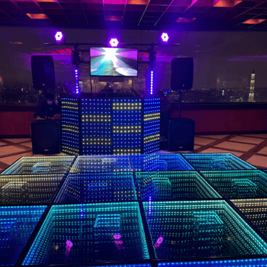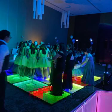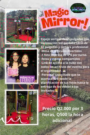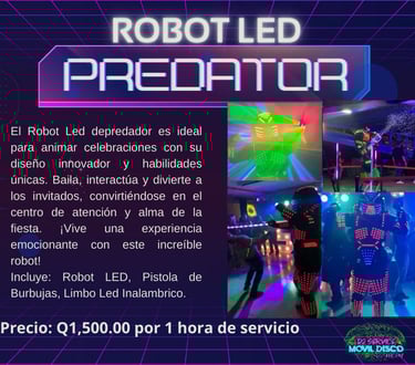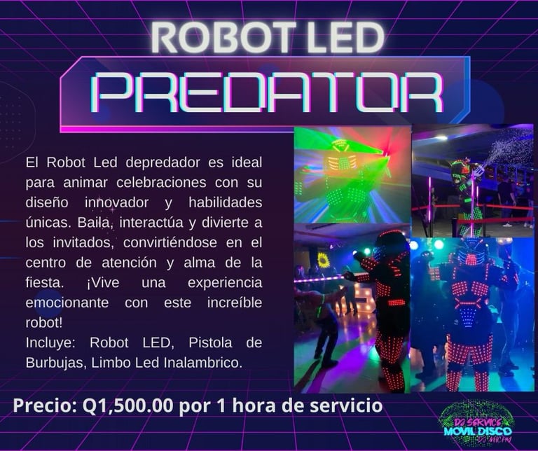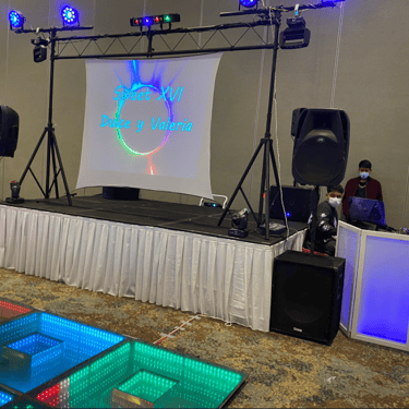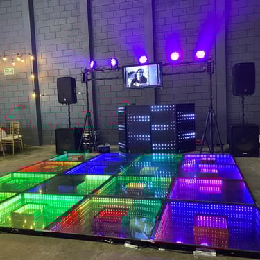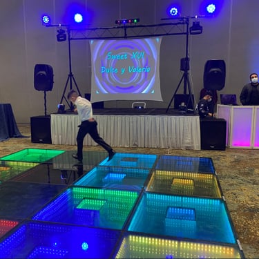 Ideal para eventos de hasta 300 personas en lugares amplios, Sonido envolvente 8 bocinas (4 sub y 4 bocinas medios y altos), estructura tipo portería con 12 luces Led y Láser audio rítmicas, matización de fondo con 6 luces led color fijo. Para matizado, máquina de niebla y burbujas (si el lugar lo permite) Pista led Infinity de 16 módulos de 1*1 metro, animación con 150 souvenirs (sombreros, diademas, collares, barras led etc) pantalla de 120 pulgadas con retroproyector. Cabina DJ iluminada con DJ Animador Profesional en vivo con música y videos de todo género y época .